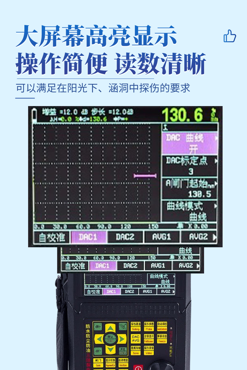 ● 大屏幕高亮顯示,可以適合在陽光下、涵洞中探傷的要求;