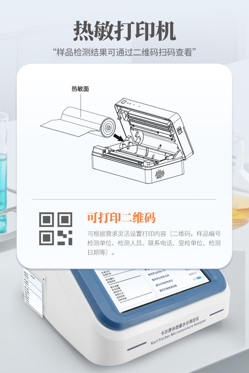 9.內置熱敏打印機,可直接打印檢測結果,并可根據需求靈活設置打印內容(二維碼,樣品編號、檢測單位、檢測人員、聯系電話、受檢單位、檢測日期等)。