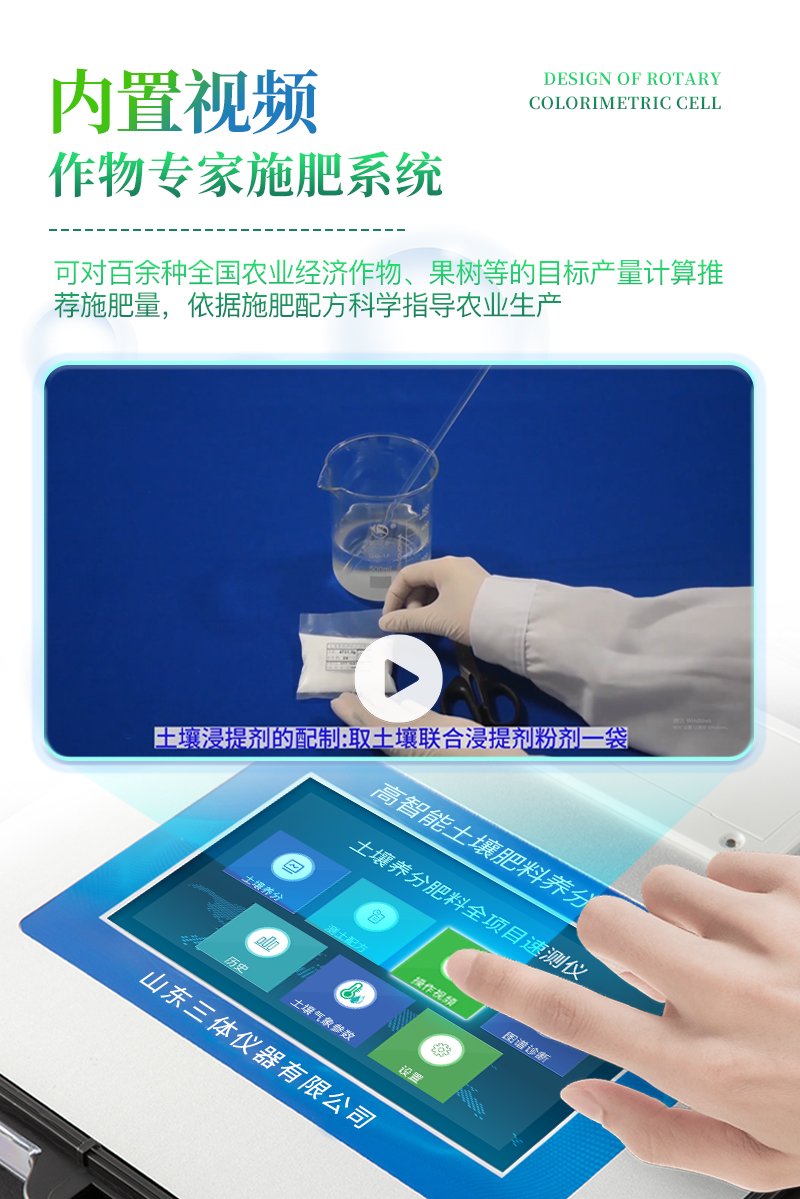 配套齊全:該儀器集藥、器、儀為一體,攜帶方便,相當于一個小型移動實驗室,無需用戶自配附件,亦可靈活野外流動測試。適于農業服務部門或農資經銷商、合作社、肥料廠商、大種植戶測土施肥和鑒別肥料真假。