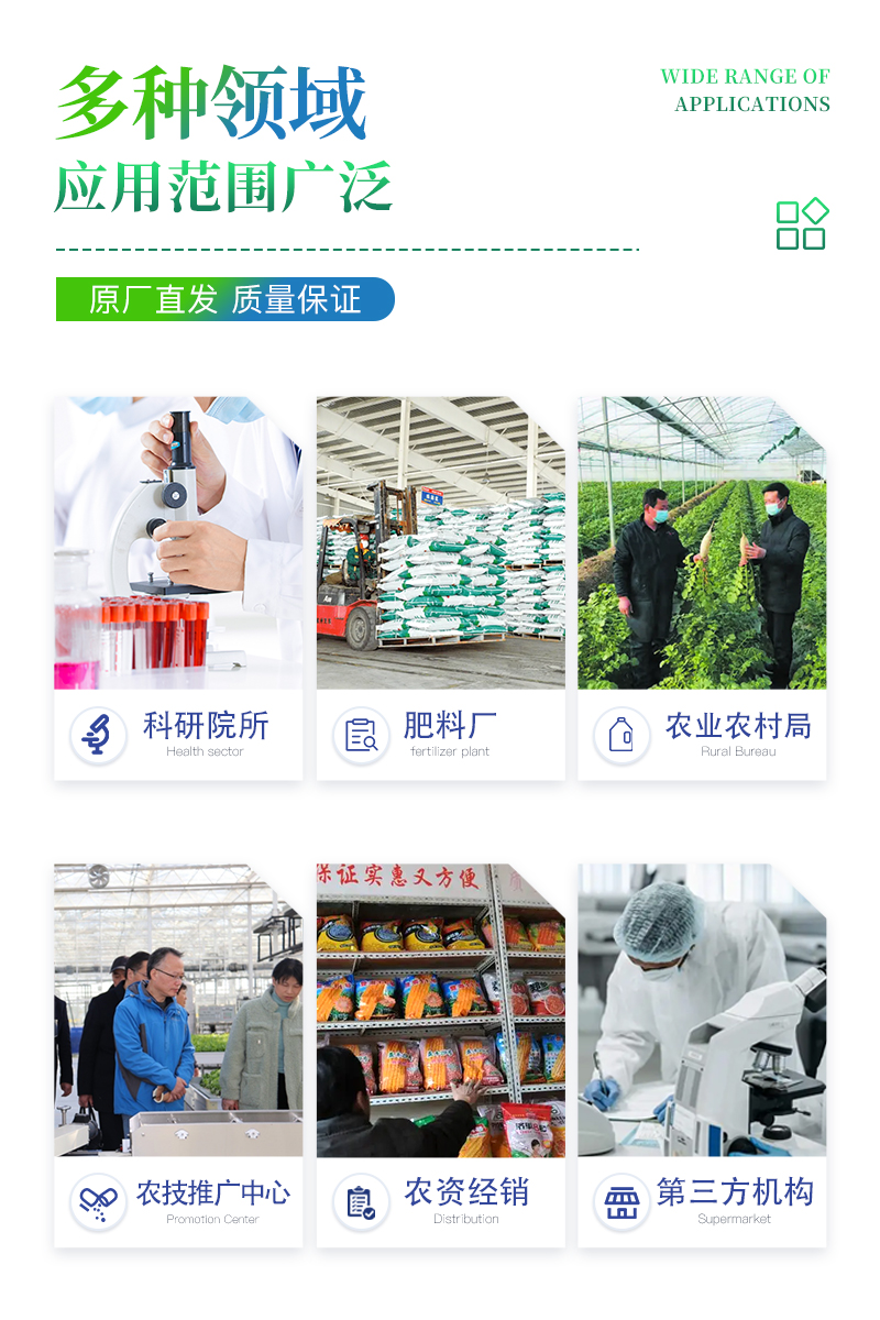 2、肥料養分:●單質肥:氮肥中銨態氮、肥料硝態氮、尿素氮、縮二脲、磷肥中磷、磷肥中水溶性磷、鉀肥中鉀;●復合肥全氮、復合肥全磷、復合肥全鉀;●有機肥全氮、有機肥全磷、有機肥全鉀、有機肥硝態氮、有機肥速效磷、有機肥速效鉀、有機肥酸解氮、有機質;●水溶性腐植酸(風化煤)、水溶性腐植酸(褐煤)、水溶性腐植酸(泥炭)、游離態腐植酸(風化煤)、游離態腐植酸(褐煤)、游離態腐植酸(泥炭);●水溶肥全氮、水溶肥全磷、水溶肥全鉀;●葉面肥全氮、葉面肥全磷、葉面肥全鉀;●各種肥料微量元素:肥料鈣、肥料鎂、肥料硫、肥料硅、肥料硼、肥料鐵、肥料銅、肥料錳、肥料鋅、肥料氯、肥料鉬;●肥料重金屬:肥料鉛、肥料砷、肥料鎘、肥料鉻、肥料汞、肥料鎳、肥料鋁、肥料氟、肥料鈦、肥料硒。