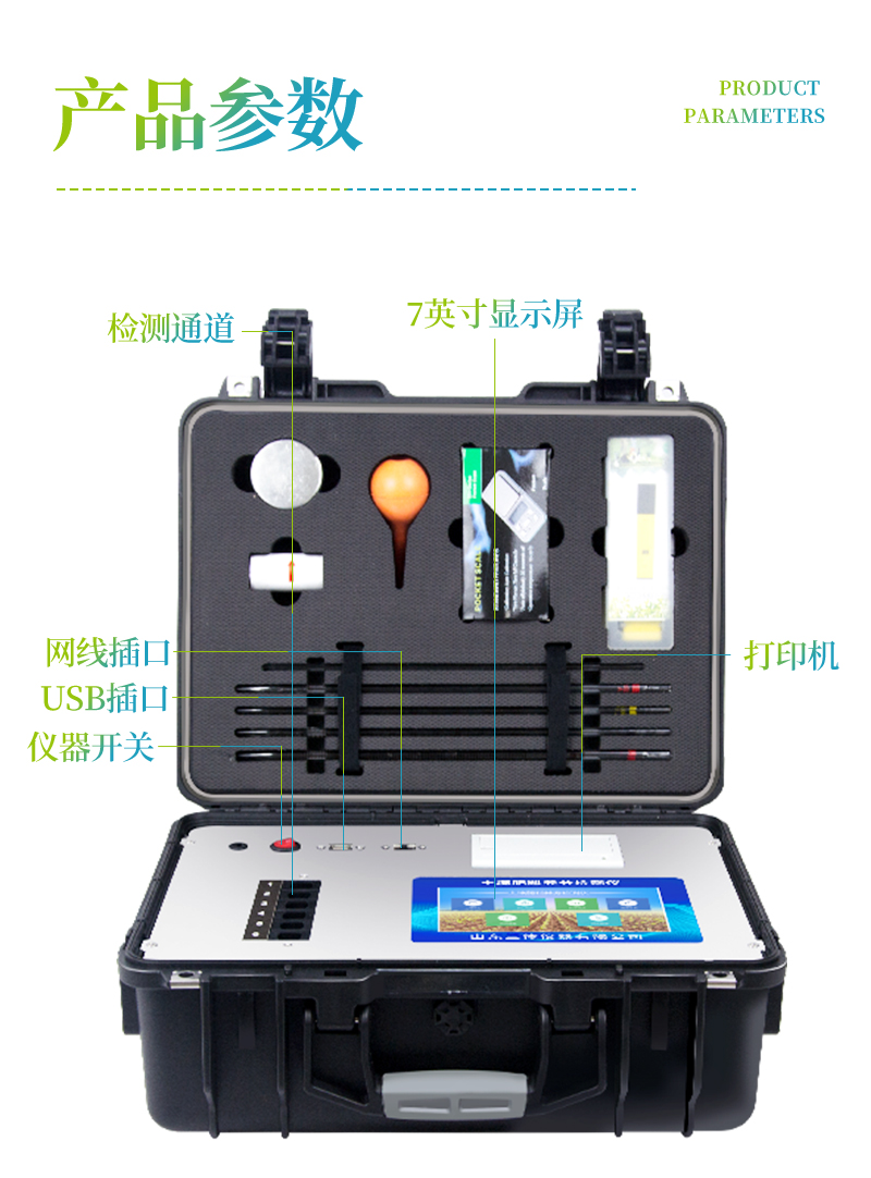 配套齊全:該儀器集藥、器、儀為一體,攜帶方便,相當于一個小型移動實驗室,無需用戶自配附件,亦可靈活野外流動測試。適于農業服務部門或農資經銷商、合作社、肥料廠商、大種植戶測土施肥。